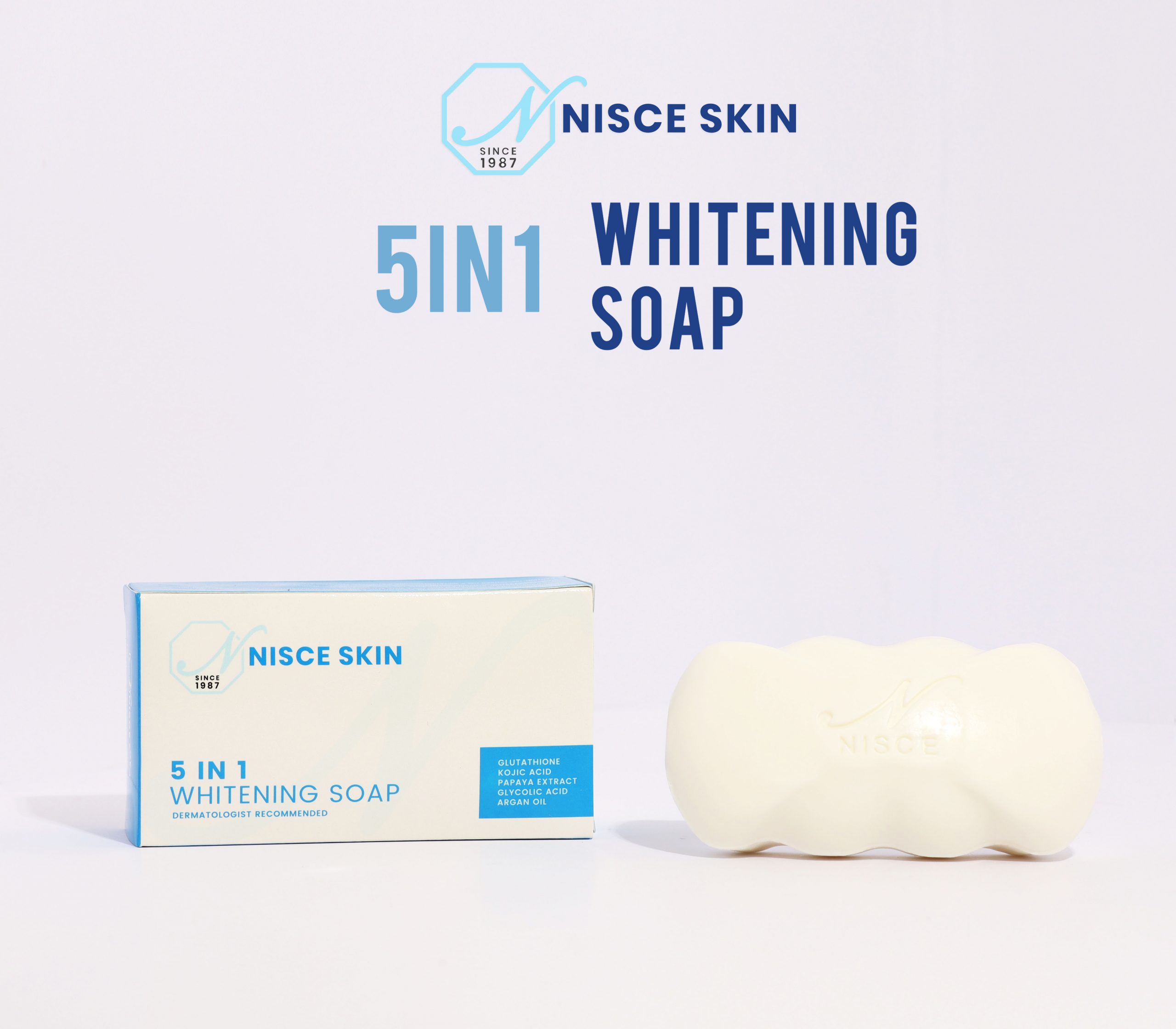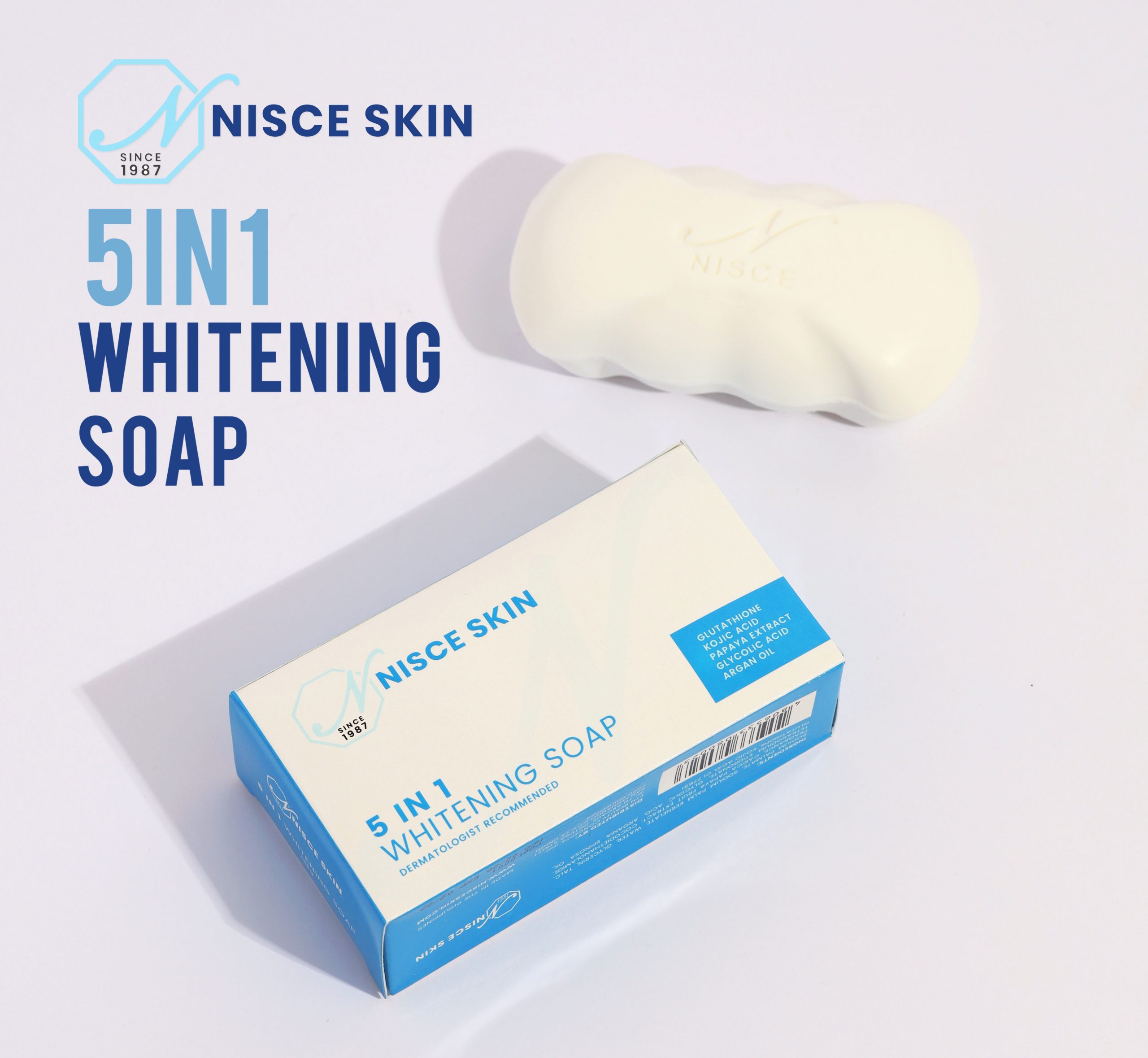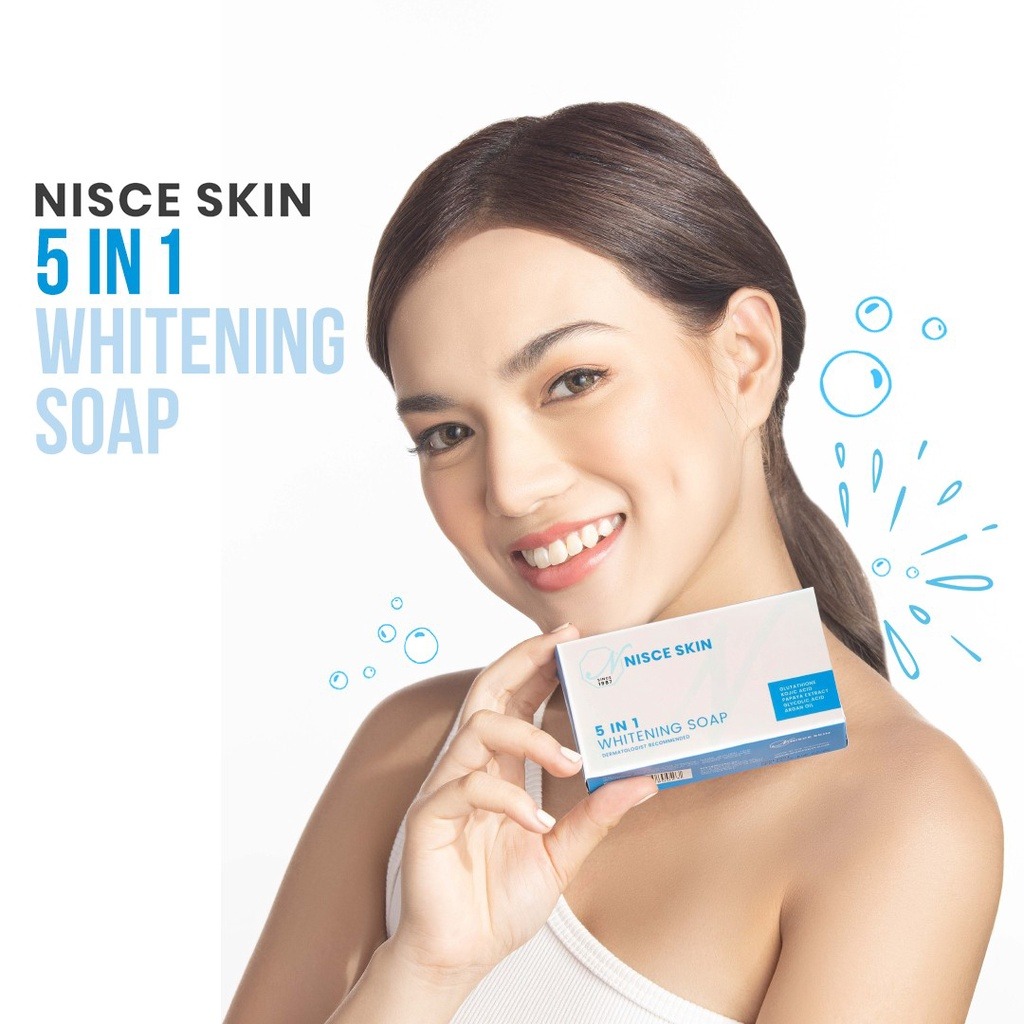 Our all-time best seller! NISCE SKIN 5in1 Whitening Soap contains Glutathione, Kojic Acid, Glycolic Acid, Papaya Extract and Argan Oil — for whitening, anti-aging and and moisturizing. All these combine to repair skin cell damage and stimulate collagen production for fairer, softer, more radiant skin.