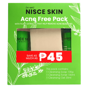 Product inclusion: 1 Nisce Skin Acne Free Cleansing Soap 100g; 1 Nisce Skin Acne Free Cleansing Toner 100mL; 1 Nisce Skin Acne Free Cleansing Gel 35mL.