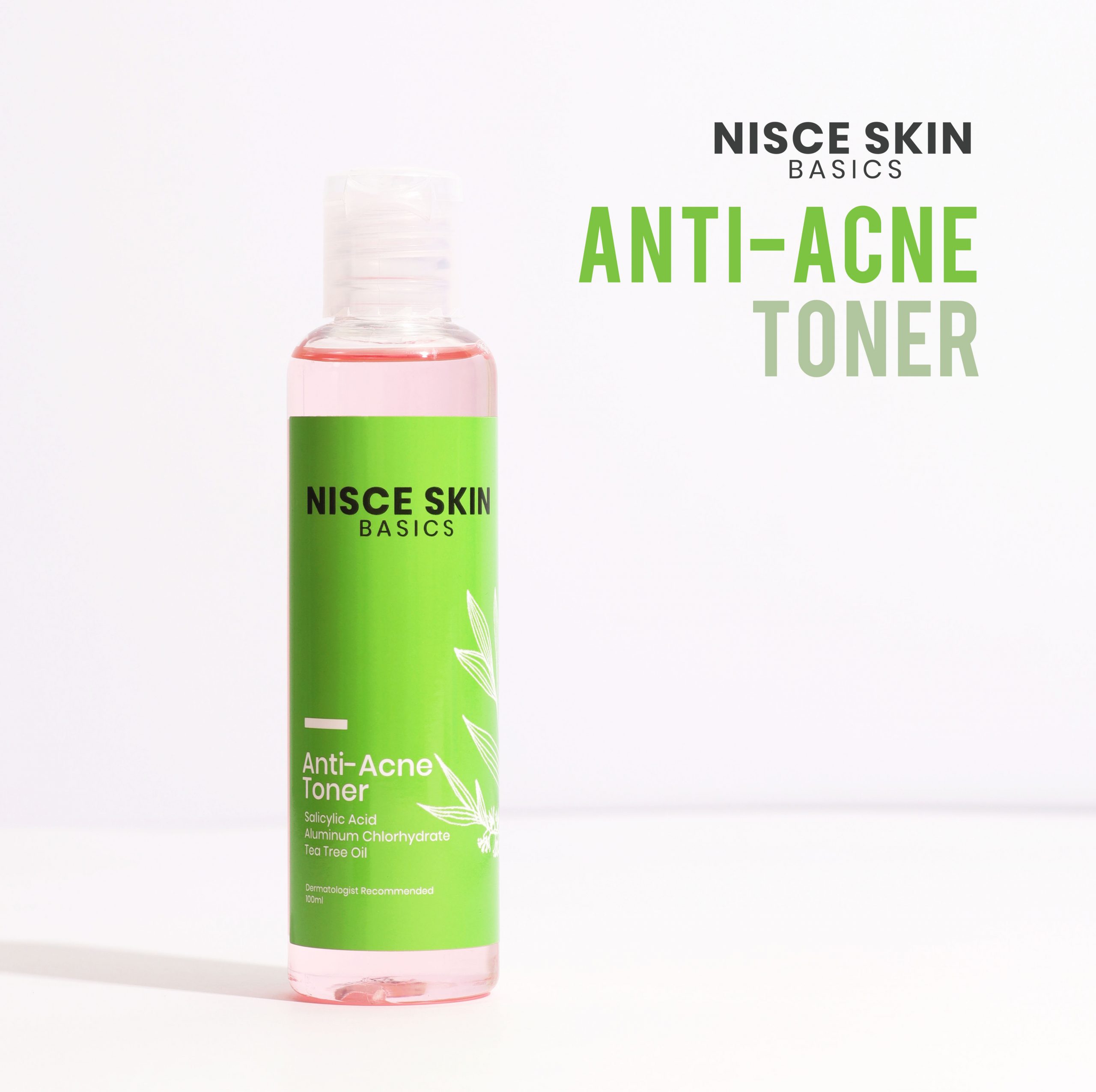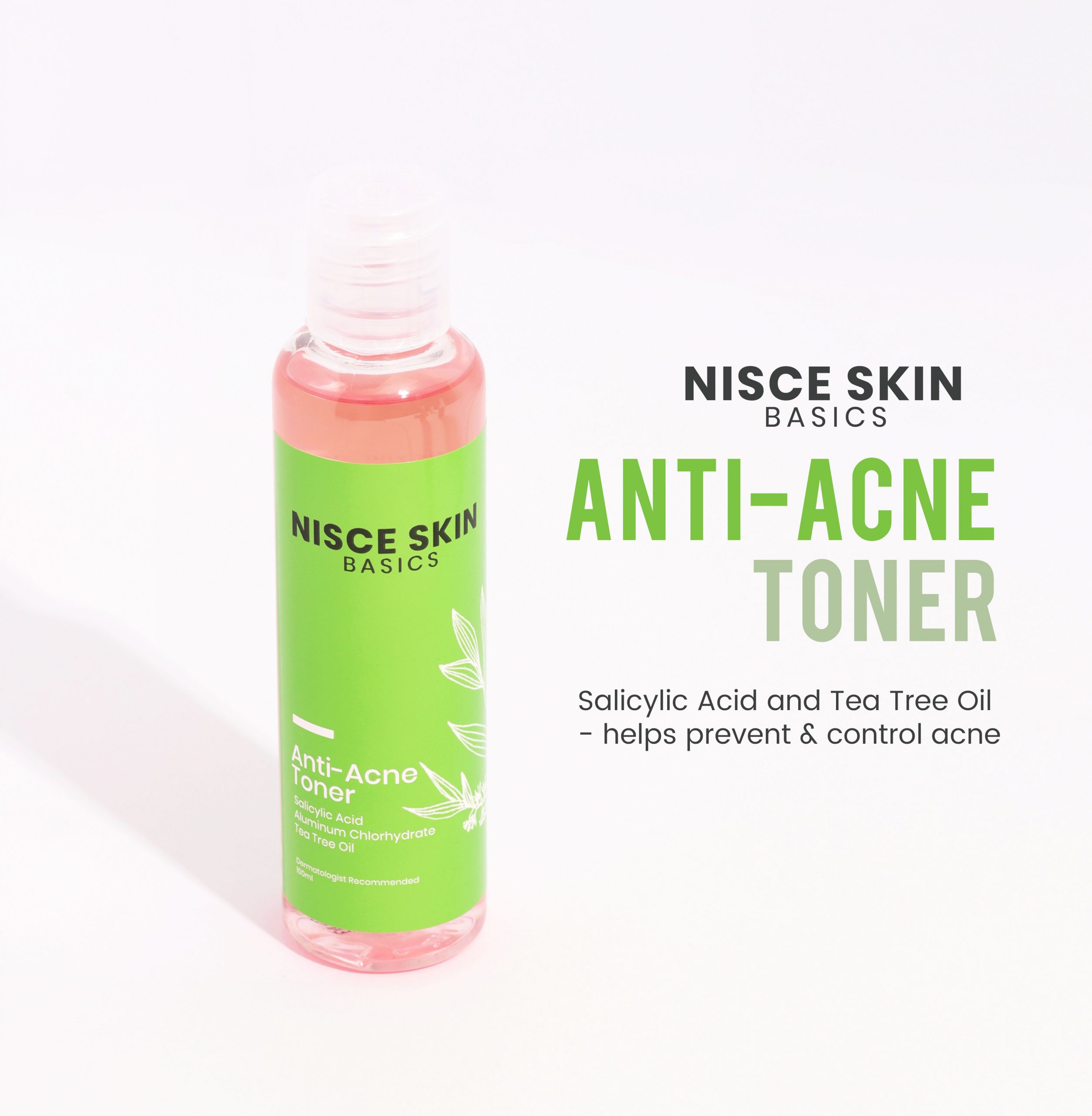 A toner specially formulated for acne-prone skin, NISCE SKIN BASICS Anti-Acne Toner effectively treats acne, excessive sebum production and large pores. It contains potent ingredients such as Salicylic Acid that unclogs pores and breaks down dead skin cells; Tea Tree Oil known for effective treatment of acne and anti-bacterial properties; and Aluminum Chlorohydrate that helps reduce pore size.